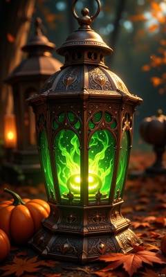 A warm and eerie glow emanates from a vintage-style lantern crafted with gleaming crystal material, as the soft flicker of a burning flame within illuminates the intricate carvings on its surface. The air is thick with the mystical ambiance of Halloween, as a radiant green light emanates from the lantern's glowing pumpkin centerpiece, casting an otherworldly glow amidst the autumnal foliage.