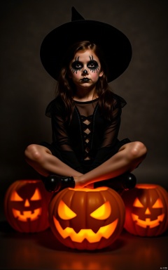 Halloween makeup,a girl sitting on a pumpkin lantern with her legs crossed and wearing a witch's hat,a grim expression,a full-body photo,