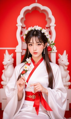 a medium-sized Asian woman, dressed in a white kimono adorned with a red ribbon tied around her waist, adorned with flowers. Her hair is long and cascades over her shoulders, adding a touch of beauty to her face. She is adorned with earrings, a headband adorned with white flowers, and a matching red ribbon. The backdrop is a vibrant red, with a white archway behind her, creating a striking contrast.