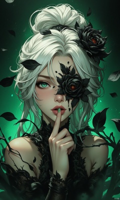 watercolor style,An Acrylic style painting that is expressive,gives it a dynamic and emotional quality. Anime art of a stylized portrait of a woman with a ethereal black and green mist surrounding her body. The mist creates a dramatic and surreal effect. A black flower,that is blooming,covering one eye,attached to the face. The woman has a cold aesthetic,complimented by her white hair. Anime art of woman draped in shadows with a lighting that enhances her unique features. The background is dark green,filled with black rose petals. Holding finger to lips,shush,shushing motion,.,Winslow Homer style,