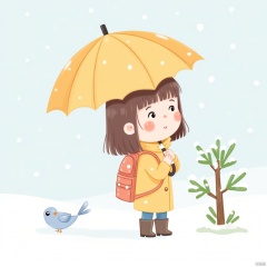 1girl, umbrella, bag, backpack, brown hair, outdoors, solo, holding, snow, holding umbrella, boots, snowing, from side, blush stickers, leaf, tree, chibi, coat, short hair, profile, long sleeves, bob cut, bird, standing, yellow coat, winter, animal, nature