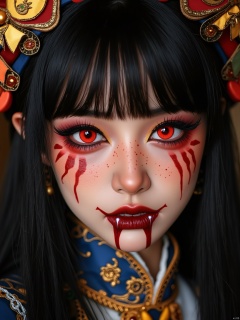 This is a highly detailed, high-resolution photograph of a young woman with a striking, anime-inspired makeup look. She has fair skin with a light dusting of freckles, particularly prominent on her cheeks. Her eyes are large and almond-shaped, accentuated with thick, dark eyeliner and voluminous false lashes. The irises are a vivid, striking red, adding a dramatic contrast to her eye makeup. Red streaks are painted across her face, particularly on her cheek and forehead, adding a bold, almost tribal aesthetic.Her lips are full and painted a deep, matte red, matching the red in her eyes. She has sharp, pointed teeth, which are slightly visible, giving her a slightly fanged appearance. Her hair is long and straight, black with a slight glossy sheen, and styled with blunt bangs that frame her face. She wears a colorful, ornate headpiece that has a mix of yellow, red, and gold patterns, adding to the eclectic and fantasy-like nature of her attire.Her outfit is a rich, dark blue garment with intricate gold embroidery and lace details, suggesting a traditional or historical theme. The overall image is vibrant and bold, capturing a mix of anime and fantasy aesthetics.