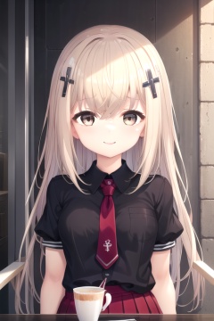 ((masterpiece)),(best quality),official art,extremely detailed CG,unity 8k wallpaper,ultra detailed,beautiful detailed eyes,extremely detailed face,outdoors,1girl,solo,upper body,(portrait:1.5),looking at viewer,facing viewer,(petite:1.3),smile,Tier Fallentite,long hair,blonde hair,cross hair ornament,hair intakes,hair between eyes,bangs,brown eyes,school uniform,black shirt,collared shirt,red necktie,puffy short sleeves,shirt tucked in,large breasts,red skirt,pleated skirt,black thighhighs,lace-trimmed legwear,loafers,<lora:Tier Fallentite(hsr)>,