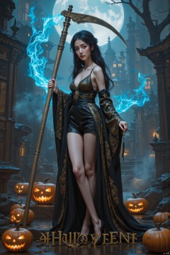 a woman,halloween,WSJFLUX,((masterpiece, highest quality, Highest image quality, High resolution, photorealistic, Raw photo, 8K)), ((Extremely detailed CG unified 8k wallpaper)), (huge stunning goddess shot, very hot and sexy, jaw-dropping beauty, perfect proportions, beautiful body, slim body beauty:1.4), A girl wielding a huge scythe, movie poster, large "Halloween" written at bottom of screen,blue fire