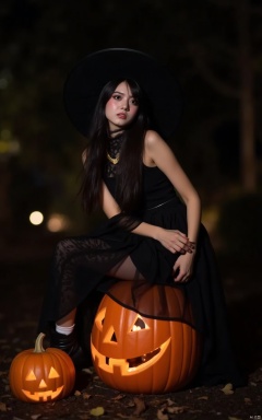 Halloween makeup,a girl sitting on a pumpkin lantern with her legs crossed and wearing a witch's hat,a grim expression,a full-body photo,