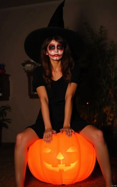 Halloween makeup,a girl sitting on a pumpkin lantern with her legs crossed and wearing a witch's hat,a grim expression,a full-body photo,
