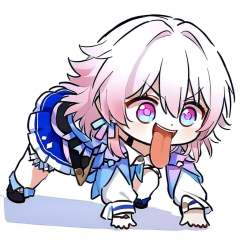 masterpiece,best quality,<lora:all fours_a31-xl:1>,chibi, all fours, open mouth, tongue out, full body, 1girl, march 7th \(honkai: star rail\), tongue, pink hair, solo, blue eyes, jacket, black footwear, medium hair, skirt, blue jacket, earrings, blue skirt, long sleeves, jewelry, two-tone eyes, white background, white shirt, single earring, pink eyes, shirt, tied jacket, v-shaped eyebrows, teeth, simple background, black corset, hair between eyes
