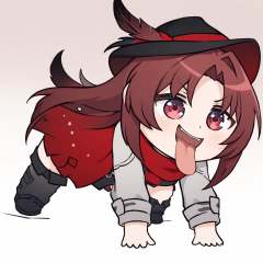 masterpiece,best quality,<lora:all fours_a31-xl-000004:1>,chibi,all fours,open mouth,tongue out,full body,<lora:JXXLV1:1>,1girl,red hair,hat,hat feather,red scarf,