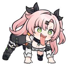 masterpiece,best quality,<lora:all fours_a31-xl:1>,chibi,all fours,open mouth,tongue out,full body,<lora:nicole_demara_a31-xl_v1:1>,1girl,nicole_demara,breasts,solo,smile,cleavage,two_side_up,tube_top,hair_ribbon,strapless,pink_hair,ribbon,white_background,crop_top,black_ribbon,hair_ornament,mole_on_breast,simple_background,bare_shoulders,grin,long_sleeves,clothing_cutout,midriff,jacket,black_jacket,