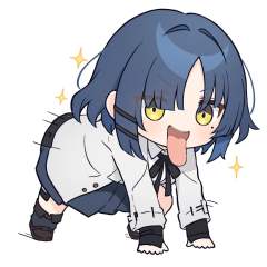 masterpiece,best quality,1girl,yamada_ryo,blue_hair,solo,mole,shirt,mole_under_eye,ribbon,white_shirt,yellow_eyes,shimokitazawa_high_school_uniform,neck_ribbon,short_hair,holding,black_ribbon,collared_shirt,sparkle,long_sleeves,hair_ornament,simple_background,hairclip,eyes_visible_through_hair,school_uniform,hair_over_one_eye,white_background,looking_at_viewer,<lora:all fours_a31-xl:1>,chibi,all fours,open mouth,tongue out,full body,