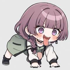 masterpiece,best quality,1girl,hiroi_kikuri,solo,anger_vein,jacket,black_nails,braid,@_@,purple_eyes,purple_hair,open_jacket,long_hair,open_clothes,simple_background,bow,green_dress,jewelry,dress,hair_bow,earrings,single_braid,black_jacket,nail_polish,smile,white_jacket,hair_over_shoulder,blunt_bangs,long_sleeves,black_bow,blush,grey_background,<lora:all fours_a31-xl:0.8>,chibi,all fours,open mouth,tongue out,full body,