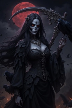 1girl, solo, long hair, breasts, looking at viewer, large breasts, black hair, hair ornament, long sleeves, dress, cleavage, jewelry, closed mouth, earrings, outdoors, hand up, necklace, black dress, bracelet, night, bird, moon, fire, full moon, scythe, crow, red moon, bird on hand