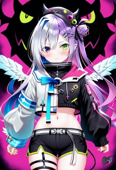 beast_quality,masterpiece,8k,1girl,tokoyami towa,mesugaki,devil,amane kanata,angel,split theme,stylish,artist, closed mouth