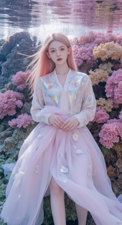 A mesmerizing underwater scene: a single girl stands majestically amidst the vibrant coral reef, her long hair flowing like seaweed in the pink mist. Her pink locks cascade down her back, while her upper body is adorned with a flowing shirt that appears to be made of iridescent sea scales. The flowers on her shirt seem to bloom in harmony with the colorful coral formations. Sharp focus and ultra-fine painting bring every detail into crystal clarity, as if gazing through an 8K lens. Studio lighting enhances the subject's features, casting a warm glow on her face. Every strand of hair, every petal, and every scale is exquisitely rendered in masterful detail, making this a true masterpiece of fantasy art.,shiny pantyhose,luoxue