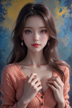 Captured in a close-up, eye-level shot, a beautiful Asian woman with long, straight brown hair stands in front of a multicolored backdrop. She is dressed in a salmon colored sweater, her hair cascades over her shoulders, adding a touch of movement to her face. Her eyes are a piercing blue, her lips are a deep red, her nose is a lighter shade of pink. Her hands are clasped in a relaxed fashion, her hands resting on her chest. The backdrop is a mix of blue, yellow, and green, creating a vibrant contrast to the woman's skin.