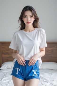 Captured at eye-level, a medium-sized Asian woman stands in front of a bed. She is wearing a short-sleeved white t-shirt and blue shorts with the letters "T" and "X" printed on them in white. Her hair is long and brown, her eyes are a deep-brown, and she has a slight smile on her face. Her left hand is resting on her hip, and her right hand is slightly bent at the elbow. The background is blurred, but it is a sunny day. The bed she is standing on has a white bedspread on it, and there is a wooden headboard behind her.