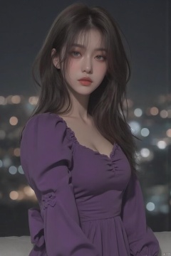 (1 lady), (Best quality at best:1.4), (ultra - detailed), (extremely detailed CG unified 16k), A Beautiful Woman with Perfect Figure: 1.4, Sharp Focus: 1.2, very detailed, High-definition RAW color photo, professional photoshooting, amazing face and eyes, cosmetics, (amazingly beautiful girl), ((frederica bernkastel)), ((purple bow, dress, frills, white kneehighs, kneehighs bow, mary janes, cat tail, tail ornament)), standing, sexyposture,(Dark and stylish huge gothic cathedral from outside, city lights at night, city lights:1.3), (look from down), realistic cinematic face, head to feet long wide zoomed out view, full body long view, photorealistic, ((realistic natural purple hair style, purple eyes, long hair)), gorgeous, extremely beautiful face, perfect model beauty, pout mouth, Highly Detailed Face and Skin Texture, Detailed Eyes, Double Eyelids, Big Breasts, Smile, cleavages, western, (masterpiece), best quality, high resolution, extremely detailed, blurred background, depth of field, cinematic lighting, amazing legs, high heels, clear and well-cared skin,