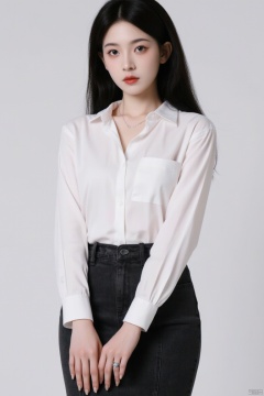 1girl,solo,breasts,long hair,cleavage,black hair,skirt,looking at viewer,large breasts,realistic,brown eyes,shirt,lips,red lips,see-through,white shirt,collarbone,simple background,shirt tucked in,pencil skirt,grey background,long sleeves,high-waist pants,makeup,cowboy shot,