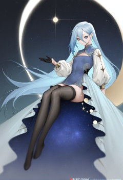 best quality,masterpiece,absurdres,newest,(quuni:1.4),(nyatabe:0.9),(cutesexyrobutts:0.3),(iuui:0.7), (shanyao jiang tororo:1.1), (ohisashiburi:1.1),(fine fabric emphasis, realistic),1girl, long hair, solo, dress, blue hair, thighhighs, closed eyes, very long hair, hair between eyes, full body, closed mouth, long sleeves, smile, bangs, gloves, black legwear, simple background, blue eyes, looking at viewer,This digital illustration showcases a fantasy-themed character, likely inspired by anime or manga. The central figure is a young woman with long, flowing blue hair and fair skin. She wears an elaborate, flowing blue and white gown adorned with gold accents and celestial motifs, including stars and moons. The gown features a high collar and long, billowing sleeves. The character is perched on a crescent moon, which dominates the upper half of the image, creating a dramatic backdrop. The moon is detailed with intricate star patterns and a deep blue, starry sky in the background. The woman's pose is graceful and slightly ethereal, with one arm resting on the moon and the other hand delicately touching her face. Her eyes are closed, and she exudes a serene, contemplative mood. The lighting is soft and ethereal, with a gentle glow illuminating her from behind, casting a soft shadow and highlighting the texture of her gown. The background is blurred, drawing focus to the character and the moon. The composition uses a shallow depth of field, with the character sharply in focus against a blurred, starry night sky. The overall mood is dreamy and mystical, enhanced by the delicate, flowing lines and the use of celestial imagery.