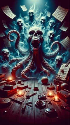 A stunning horror a professional (film grain:1.2) photography, realistic photo of a dark cursed tormented alteration digital art, vibrant colors, eight playful, musically-inspired octopuses, orchestra, instruments, sheet music, surreal, interactive, 3D rendered, intricate details, symmetrical, glowing accents, reflective surfaces, shiny, glass-like textures, clean, crisp, detailed, concept art, dynamic, energetic, lively, neon, pastel, gradient background, dreamlike, whimsical, imaginary, watercolor, impressionistic, fantasy, mythical, enchanting, fairytale, storybook, illustration, surreal, optical illusion, infinity, infinite loop, repetition, spiraling, twisting, turning, mind-bending, thought-provoking, engaging, captivating, astonishing, astonishment, wonder, awe, amazement, breathtaking, mesmerizing, hypnotizing <lora:DarkmosphericFlux:0.75>, gas spirit rising up, high resolution photography, ultra resolution, 4k, 8k, 16k, HDR, DOF, studio photography, professionalism<lora:AHauntedFlux:0.75>photography,natural lighting,soft shadows,close-up shot,waist-up framing,eye-level angle,direct perspective,popping colors,popart style,Double Complementary (Tetradic) color palette,sensual lighting,majestically strides forward toward us with abandon,(masterpiece,best quality,ultra-detailed,highres),(wide angle view:1.4),shot on Pentax K-1 Mark II with Pentax FA 43mm f-1.9 Limited