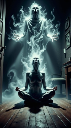 A stunning horror a professional (film grain:1.2) photography, realistic photo of a dark cursed atmospheric smoking AHaunted Yoga, gas spirit rising up, high resolution photography, ultra resolution, 4k, 8k, 16k, HDR, DOF, studio photography, professionalism<lora:AHauntedFlux:0.9>photography,Natural daylight,eye-level shot,soft focus,(natural skin texture,hyperrealism,soft light,sharp:1.2),glow effect,matte skin,pores,wrinkles,(overhead shot:1.2),shot on Canon PowerShot G5 X Mark II with Built-in 8.8-44mm f-1.8-2.8