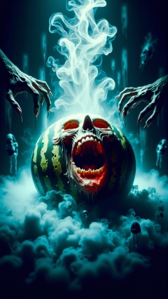 A stunning horror a professional (film grain:1.2) photography, realistic photo of a dark cursed screaming gruesome watermelon <lora:DarkmosphericFlux:0.65>, gas spirit rising up, high resolution photography, ultra resolution, 4k, 8k, 16k, HDR, DOF, studio photography, professionalism<lora:AHauntedFlux:0.75>photography,warm lighting,close-up shot,low angle,(abstract:1.3),flowing,volumetric lighting,bioluminiscent,strong backlight,(bilaterally symmetrical:1.2),shot on Ricoh GR III with GR 18.3mm f-2.8
