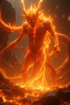 A fiery, intense scene featuring a towering flame demon, its body composed of roaring flames and molten lava. The demon stands in a volcanic landscape, with molten rock and ash swirling around it. The composition is wide-angle, capturing the scale of the demon and its surroundings. The lighting is harsh and dramatic, with bright orange and red hues dominating the scene. The demon's eyes burn with an intense, malevolent glow, and it wields a massive, flaming sword. The location is chaotic, with erupting volcanoes and scorched earth adding to the apocalyptic atmosphere.