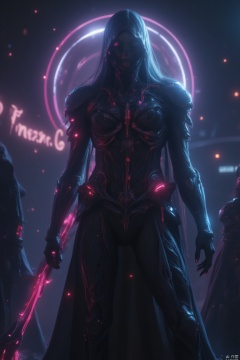 A cyberpunk-inspired Death, clad in sleek, dark armor with neon accents, wields a futuristic scythe in a dynamic, low-angle shot. The scene is dimly lit with neon lights, casting a vibrant, electric glow. The Death's posture is commanding, with a fierce expression, framed to emphasize the contrast between the dark armor and the glowing scythe. The composition is centered on the Death, with the neon lights adding depth and atmosphere, creating a striking, futuristic take on the traditional grim reaper.