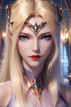 1girl, solo, long hair, looking at viewer, blue eyes, blonde hair, closed mouth, indoors, lips, circlet, red lips,full body,