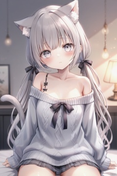 (masterpiece), (best quality), illustration, ultra detailed, hdr, Depth of field, (colorful),loli,head tilt,backlighting,glowing,float light,1girl, solo, long hair, looking at viewer, blush, bangs, white eyes, long sleeves,bow, animal ears, bare shoulders, very long hair, closed mouth, collarbone, tail, white hair, hair bow, grey hair, off shoulder, sweater, animal ear fluff, sleeves past wrists, cat ears, black bow, cat tail, cat girl, grey shirt, low ponytail, puffy long sleeves, grey sweater,indoor