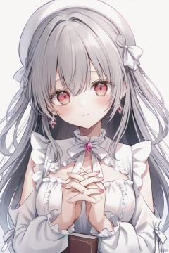 1girl, solo, long hair, breasts, looking at viewer, blush, bangs, shirt, red eyes, long sleeves, white background, dress, bow, hair between eyes, jewelry, medium breasts, closed mouth, white shirt, upper body, hair bow, grey hair, earrings, frills, puffy sleeves, nail polish, white dress, book, white headwear, hair intakes, own hands together, white bow, gem, interlocked fingers, pink nails, book stack