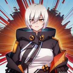 (masterpiece:1.3),(the best quality:1.2),(super fine illustrations:1.2),(Masterpiece),high quality,high detail,(white background:1.2),looking at viewer,(SOLO:1.4),outline,simple background, 1girl,scythe,orange theme,holding weapon,black footwear,hood down,short hair,dress,black dress,white hair,bangs,thighhighs,black jacket,yellow eyes,orange eyes,jacket,hair between eyes,solo,gloves,