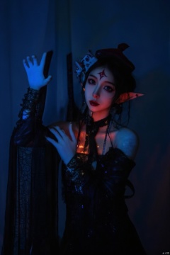 A striking image of a solo female figure with long black hair and a hat, gazing directly at the viewer. Her piercing blue eyes seem to gleam in the dimly lit atmosphere. The exposed shoulders reveal intricate jewelry adorning her upper body. Detached sleeves frame her pointy ears, which sport a fang-like protrusion. Her lips are painted a deep red, complementing her fingernails. A clothing cutout accentuates her curves, while Chinese-inspired attire wraps around her slender figure. A striking facial mark and piercing ear studs add to the overall mystique. In her hand, she grasps an ofuda, evoking the supernatural essence of a jiangshi. The qing guanmao's eerie glow casts an otherworldly ambiance, drawing us in with its haunting beauty.