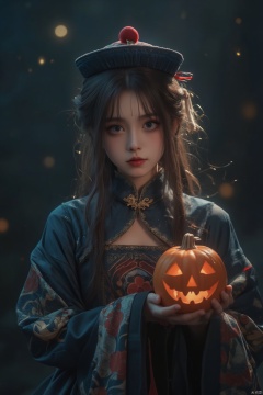 A stunning 8K visual masterpiece! A single female figure stands out against a darkened backdrop, her long brown hair cascading down her back like a golden waterfall. Her gaze is fixed directly at the viewer, an air of quiet determination etched on her face. She wears a flowing Chinese-inspired outfit with wide sleeves and a hat adorned with intricate designs. In one hand, she holds an ofuda, its delicate threads seemingly suspended in mid-air. The other hand cradles a jack-o'-lantern, its carved design glowing softly in the dim light. Her facial expression is marked by a subtle, enigmatic smile. The atmosphere is eerie yet captivating, as if time itself has frozen around her.