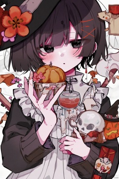 1girl, solo, looking at viewer, blush, short hair, bangs, black hair, hair ornament, long sleeves, hat, dress, holding, jewelry, upper body, flower, earrings, parted lips, food, hair flower, medium hair, white dress, black eyes, black headwear, makeup, witch hat, red flower, candy, pink flower, halloween, skull, ghost, jack-o'-lantern, red lips, witch, pumpkin, orange flower, halloween bucket