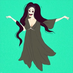 set4n, kuntilanak, a woman with long hair, flying. in the style of t0k