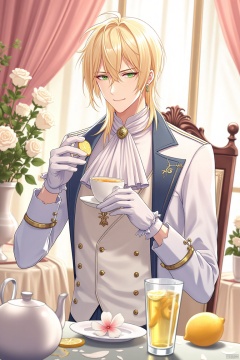A male figure with medium hair, wearing a white shirt with long sleeves, a jacket with notched lapels, and a white ascot, smiles at the viewer. He holds a cup with a lemon slice, adorned with a brooch and earrings. A rose in a vase and a teapot on a table with a tablecloth and curtains in the background. A single white flower with petals and frills lies on the table, next to a lemon and a drinking glass. The focus is on the upper body, with gloves and a vest completing the ensemble.