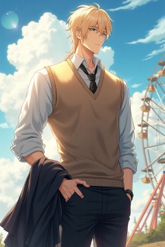 A solo male figure in a collared shirt with long sleeves, a sweater vest, and pants stands outdoors, hand in pocket, holding an unworn jacket. He wears a necktie and a closed mouth, looking to the side with a lens flare effect. The male focus is on him, with a cowboy shot framing, clouds and sky in the background, and a ferris wheel nearby. The scene is set outdoors, with an unworn jacket in hand.
