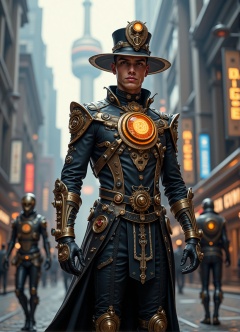 Confident 25-year-old man stands tall amidst steampunk metropolis's bustling streets, high-tech outfit gleaming with intricate gears, brass filigree, and pulsing crystal runes. Sleek hat adorned with delicate gears mechanism crowns his head. Dynamic pose showcases futuristic-steampunk fusion as ancient rune stones meet modern machinery in the city's skyline, surrounded by walking robots, vibrant aura crackling with energy.