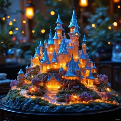 a detailed detailed model of a castle-like castle is adorned with lights, adding a touch of color to the scene. The castle-shaped structures are adorned with a variety of colors, including blue, orange, and purple. The scene is set on a black table, with a backdrop of trees and lights that are blurred.