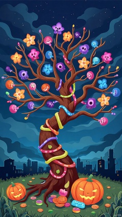 On Halloween night, a giant candy tree stands in the grass, its trunk wrapped with colorful candy vines. Each leaf is a transparent candy flake that glows with a sweet glow. The branches are covered with candies of all shapes, pumpkin flavored, ghost shaped, and even purple skull candies. Occasionally, a leprechaune flies by and tries to pluck the candy, only to bounce off the magical guard on the tree, leaving happy laughter and a sweet aroma in the air