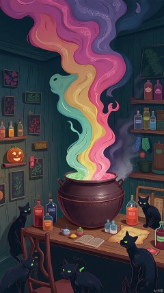 In a darkened room, multicolored smoke rose from a huge alchemist pot, and the air was filled with the pungent smell of the potion. The walls were covered with amulets made from dried flowers and pumpkin seeds, emitting a faint glow. On the alchemist's table were strange bottles filled with mysterious liquids and labeled with incantations. At the corner of the table, a few black cats watched quietly, their eyes shining green, as if guarding the wizard's secrets. Occasionally, the potions in the pot bubbled and uttered faint whispers that seemed to tell of mysterious things about to happen