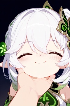 1girl, long hair, blush, smile, bangs, hair ornament, white background, hair between eyes, bare shoulders, closed mouth, closed eyes, white hair, multicolored hair, green hair, solo focus, pointy ears, side ponytail, gradient hair, pov, 1other, female child, pov hands, hand on another's chin, nahida \(genshin impact\),loli,