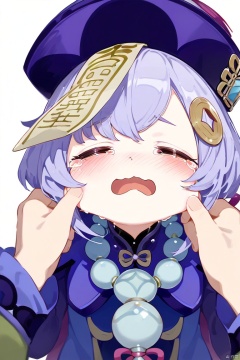 1girl, blush, open mouth, bangs, hair ornament, long sleeves, 1boy, dress, jewelry, closed eyes, purple hair, solo focus, tears, necklace, blue dress, pov, crying, tearing up, beads, ofuda, pov hands, jiangshi, bead necklace, pinching, qing guanmao, cheek pinching, coin hair ornament, cheek pull, qiqi \(genshin impact\),loli,