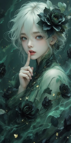 watercolor style,An Acrylic style painting that is expressive,gives it a dynamic and emotional quality. Anime art of a stylized portrait of a woman with a ethereal black and green mist surrounding her body. The mist creates a dramatic and surreal effect. A black flower,that is blooming,covering one eye,attached to the face. The woman has a cold aesthetic,complimented by her white hair. Anime art of woman draped in shadows with a lighting that enhances her unique features. The background is dark green,filled with black rose petals. Holding finger to lips,shush,shushing motion,.,Winslow Homer style,