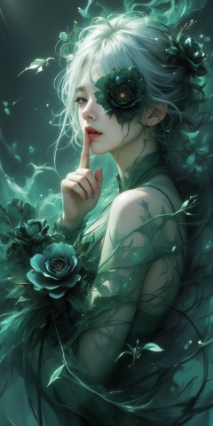 watercolor style,An Acrylic style painting that is expressive,gives it a dynamic and emotional quality. Anime art of a stylized portrait of a woman with a ethereal black and green mist surrounding her body. The mist creates a dramatic and surreal effect. A black flower,that is blooming,covering one eye,attached to the face. The woman has a cold aesthetic,complimented by her white hair. Anime art of woman draped in shadows with a lighting that enhances her unique features. The background is dark green,filled with black rose petals. Holding finger to lips,shush,shushing motion,.,Winslow Homer style,