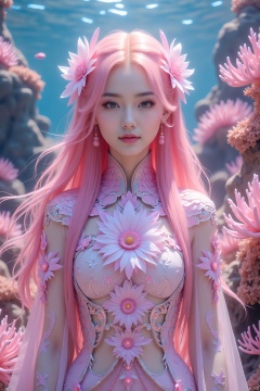 A mesmerizing underwater scene: a single girl stands majestically amidst the vibrant coral reef, her long hair flowing like seaweed in the pink mist. Her pink locks cascade down her back, while her upper body is adorned with a flowing shirt that appears to be made of iridescent sea scales. The flowers on her shirt seem to bloom in harmony with the colorful coral formations. Sharp focus and ultra-fine painting bring every detail into crystal clarity, as if gazing through an 8K lens. Studio lighting enhances the subject's features, casting a warm glow on her face. Every strand of hair, every petal, and every scale is exquisitely rendered in masterful detail, making this a true masterpiece of fantasy art.,shiny pantyhose,luoxue