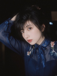 Fujifilm\(hubggirl)\, cityscape,cute hubggirl,lip biting,seductive leaning forward,detailed face,realistic,photorealistic,(studio light:1.2),Deep photo,depth of field,shadows,messy hair,seductive silhouette play,dark,nighttime,dark photo, solo, long hair, black hair, hair ornament, dress, hair bun, tree, blue dress, chinese clothes