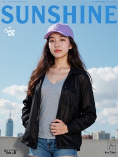 The prominent blue letters at the top of the magazine cover read 'SUNSHINE'.(RAW photo, 4k, realistic, exquisitely detailed skin),masterpiece,best quality,unity 8k wallpaper,ultra detailed,cinematic look,natural skin texture,extremely realistic skin texture,finely detailed face,(film grain:1.2),cinematic angle,Fujifilm XT3,,(highlydetailed),(bright scene)An ad for a magazine features a woman with long dark hair and a purple baseball cap. The woman is wearing a black jacket over a gray shirt and blue jean shorts.