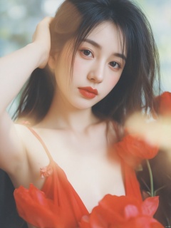 a close-up shot of a young Asian woman with long dark brown hair, wearing a red sleeveless dress, is adorned with a white smile. Her lips are painted with red lipstick, adding a pop of color to her face. The woman's hair is pulled back, cascading down her shoulders, framing her forehead. She is holding a flower in her right hand, her left hand resting on her head. The background is blurred, creating a soft glow on the woman's face.